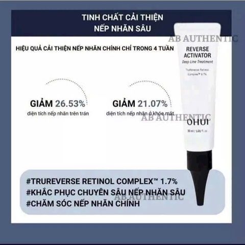 - Chứa 1.7% True Reverse Retinol Complex™ – sự kết hợp giữa retinol thuần chay DSM (Hà Lan) & phức hợp làm dịu đ-ộc quyền Ohui.