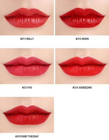 #211 Dolly: Màu đỏ cam – Chất son satin (đây là thỏi son lì có chứa dưỡng nên khi dùng sẽ tạo hiệu ứng môi bóng, thích hợp với những cô nàng yêu thích bờ môi căng mọng, quyến rũ)